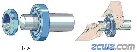 10、 軸和軸承箱(座)還裝入:用礦物油細(xì)微光滑軸承的內(nèi)孔、外圓外表。確保軸和軸承箱(座)經(jīng)由調(diào)整以使軸承裝置后與軸垂直。裝置時(shí),運(yùn)用適宜的套筒還施力在表里圈(圖8)。