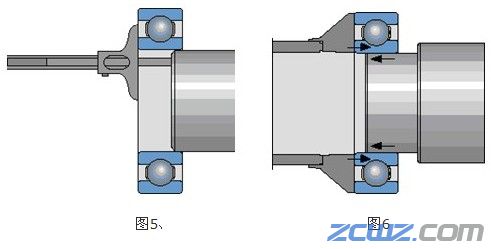 8、 軸為過盈共同:用礦物油細(xì)微光滑軸承的內(nèi)孔。裝置時(shí),確保軸承裝置后與軸垂直(圖5),運(yùn)用適宜的套筒施力在內(nèi)圈(圖6)。
