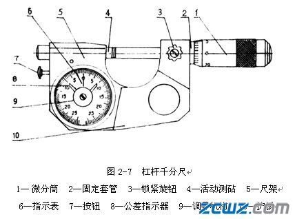 另我公司現(xiàn)有一種杠桿千分尺(如圖2-7),它是普通千分尺和杠桿卡規(guī)中的指示機構(gòu)相結(jié)合的一種量儀。由于它可用于絕對測量,所以在單件或小批生產(chǎn)中特別適用。當(dāng)檢驗成批零件時,杠桿千分尺可按標(biāo)準(zhǔn)件來調(diào)整零位,然后借千分尺上的指示機構(gòu)進行相對測量。這樣使用時,由于絲桿的螺距誤差對測量已無影響,因而可以提高測量準(zhǔn)確度。杠桿千分尺有0.001mm和0.002mm兩種。