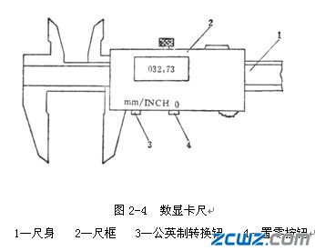 如圖2-4所示的數(shù)顯卡尺。在尺身1上均勻分布的容柵代替了刻線,通過電容傳感器與集成電路將測量爪的位移量轉(zhuǎn)換為數(shù)字顯示,在尺框2上裝有顯示窗、公英制轉(zhuǎn)換按鈕3、置零按鈕4等到。通過置零按鈕4可以隨時在尺身的任何位置置零,以便進行相對測量。數(shù)顯卡尺讀數(shù)為0.01mm/0.0005in。