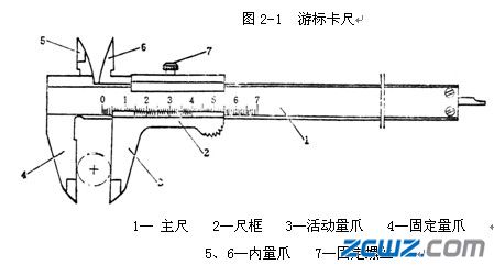游標(biāo)卡尺的外形結(jié)構(gòu),見圖2-1。它由主尺(尺身)1、帶游標(biāo)的尺框2、活動量爪3、固定量爪4、內(nèi)量爪5、6和固定螺絲7組成。在使用時,先將固定螺絲7松開,尺框2連同3、6一起在主尺上移動。測量準(zhǔn)確后,通過螺絲7緊固,以保持讀數(shù)。由于卡尺均無測力裝置,所以在使用時要防止用力過大,否則會影響測量準(zhǔn)確度。一般以量爪的測量面緊密接觸被測件同時活動量爪又無視力可見的偏轉(zhuǎn)為宜,有經(jīng)驗者多以手感掌握。