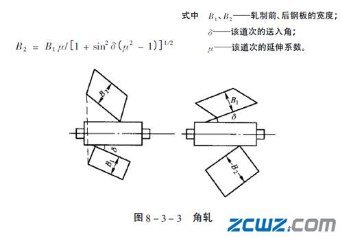 所謂角軋就是將軋件縱軸與軋輥軸線成一定角度送入軋輥進(jìn)行軋制的方法(見8-3-3)。其送入角在150~450范圍內(nèi)變化,每一對角線軋制1~2 道后即更換到另一對角線進(jìn)行軋制。軋件在角軋時每軋一道都會使軋件在原寬度方向得到一定延伸而使寬度加大,同時軋件會變成平行四邊形。當(dāng)軋件轉(zhuǎn)向另一對角線軋制時,軋件寬度繼續(xù)加大,而軋件從平行四邊形回到矩形。軋件每軋制一道其軋后寬度可按下式求出: