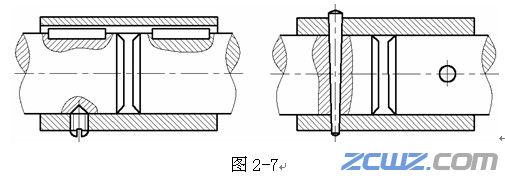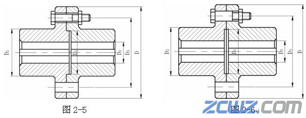 套筒聯(lián)軸器通過公用套筒以鍵或銷聯(lián)接,如圖2-7所示。套筒聯(lián)軸器結(jié)構(gòu)簡(jiǎn)單,徑向尺寸小,裝拆時(shí)一根軸需作軸向移動(dòng),沒有緩沖和吸振的功能。套筒聯(lián)軸器常用于載荷平穩(wěn)、兩軸直徑較小、兩軸對(duì)中性精度高的場(chǎng)合。
