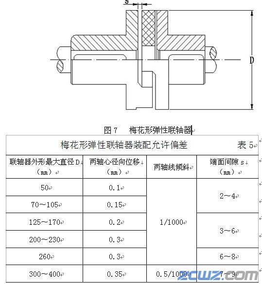 六、 梅花形彈性聯(lián)軸器(圖7裝配時,兩軸心徑向位移、兩軸線傾斜和端面間隙的允許偏差應(yīng)符合表5的規(guī)定。