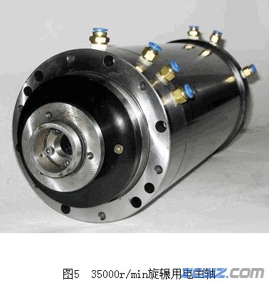 在其他制造行業(yè),如精密銅管加工行業(yè),高速電主軸也得到了廣泛的使用。精密銅管主要是用做空調(diào)、冰箱等的熱交換器,為了節(jié)省銅材和增加散熱面積,銅管往往被擠壓成內(nèi)螺紋形,而擠壓內(nèi)螺紋主要依靠高速旋輾用電主軸。以前國內(nèi)只有少量從日本和芬蘭進口的高速旋輾用電主軸,價格非常昂貴,維護也不方便。我國從1997年開始開發(fā)生產(chǎn)高速旋輾用電主軸(圖5),已形成了比較完整的系列,現(xiàn)在已經(jīng)基本占領了國內(nèi)精密銅管加工行業(yè)。電主軸采用陶瓷球軸承支承,采用油氣潤滑,其最高轉速可達到40000r/min,目前國內(nèi)采用的轉速一般為35000r/min,而世界其他先進國家使用的轉速大多停留在24000r/min,生產(chǎn)效率遠遠低于我們。我國高速旋輾用電主軸從無到有,到現(xiàn)在已經(jīng)處于國際領先水平,我國的精密銅管加工行業(yè)也從比較落后到成為世界最大的精密銅管加工國,高速電主軸的應用和發(fā)展起到了非常重要的作用。現(xiàn)在,我國高速旋輾用電主軸憑借著價格低、技術先進、維護方便等優(yōu)點,每年生產(chǎn)銷售數(shù)百套,并且批量出口到國外。