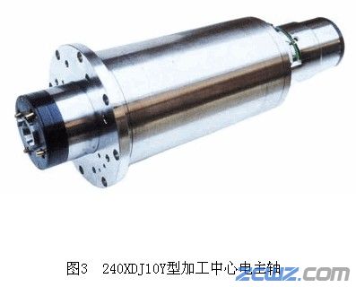 隨著我國制造業(yè)的快速發(fā)展,機床市場極為火爆。從2002年起,我國已連續(xù)3年保持了世界第一機床消費大國的地位,特別是數(shù)控機床,年增長率在30%以上。高速加工中心主軸作為數(shù)控機床的核心功能部件,也得到了長足的應用和發(fā)展。由于加工中心用電主軸(圖3)涉及電主軸高速旋轉、潤滑技術、驅動控制、準停、準速、準位等機械與電氣多方面技術,因此具有較大的技術難度,目前國內(nèi)高檔的高速加工中心主軸多為進口國外產(chǎn)品。我國也非常重視加工中心電主軸的發(fā)展,國家在“九五”和“十五”中,設立了科技攻關重點項目來開發(fā)研制加工中心用內(nèi)裝式電主軸。目前我國已開發(fā)生產(chǎn)了轉速從3000-120000r/min,最高轉速到24000r/min,最大扭矩達到200N·m的加工中心電主軸,已經(jīng)小批量裝備國產(chǎn)機床?,F(xiàn)在,加工中心電主軸正向低速大扭矩等方向發(fā)展,使電主軸在能夠實現(xiàn)較高轉速的同時,滿足低速段有盡可能大的輸出扭矩;以滿足在同一臺機床上進行低速重切削和高速精加工的要求。另外向快速起、停方向發(fā)展,以縮短輔助時間,提高效率。
