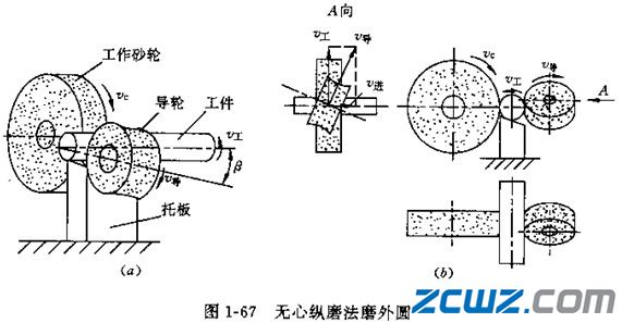大輪為工作砂輪,起切削作用。小輪為導(dǎo)輪,無(wú)切削能力。兩輪與托板構(gòu)成V形定位面托住工件。由于導(dǎo)輪的軸線與砂輪軸線傾斜β角( β=1°~6°),v導(dǎo)分解成v工和v進(jìn)。 v工帶動(dòng)工件旋轉(zhuǎn), v進(jìn)帶動(dòng)工件軸向移動(dòng)。為使導(dǎo)輪與工件直線接觸,把導(dǎo)輪圓周表面的母線修整成雙曲線。無(wú)心縱磨法主要用于大批量生產(chǎn)中磨削細(xì)長(zhǎng)光滑軸、銷(xiāo)釘、小套等零件的外圓。