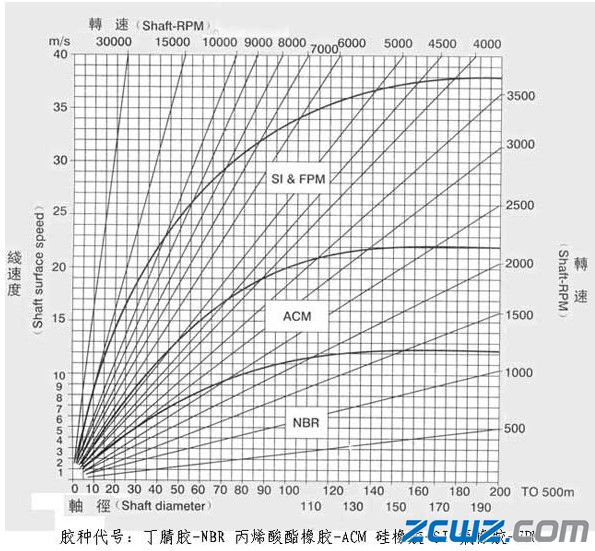 1、軸的表面線速度:在同一直徑條件下,不同材料制造的油封,適應(yīng)軸面旋轉(zhuǎn)線速度的能力不同,其關(guān)系如下圖所示。油封使用的線速度范圍一般小于15m/s, 下圖給出的容許的軸的表面線速度是參考值,滿意的潤(rùn)滑和良好的散熱條件才是決定性因素。相應(yīng)較低的數(shù)據(jù),適用于更為苛刻的條件。